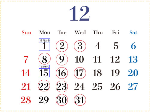 月水9:00〜19:00,木金12:00〜22:00,土日祝9:00〜18:00