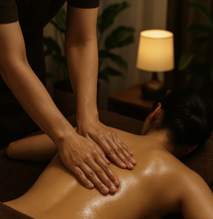 首から手先・足先までを一体に包み込むような、流れるロングストローク。一定のリズムで続く優雅な手技は、まるで波に揺られるような安らぎを感じさせ、心と体の緊張をやわらげていきます。